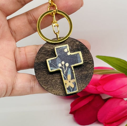 Flower Cross Keyring Decoupage Wood Keychain For Women