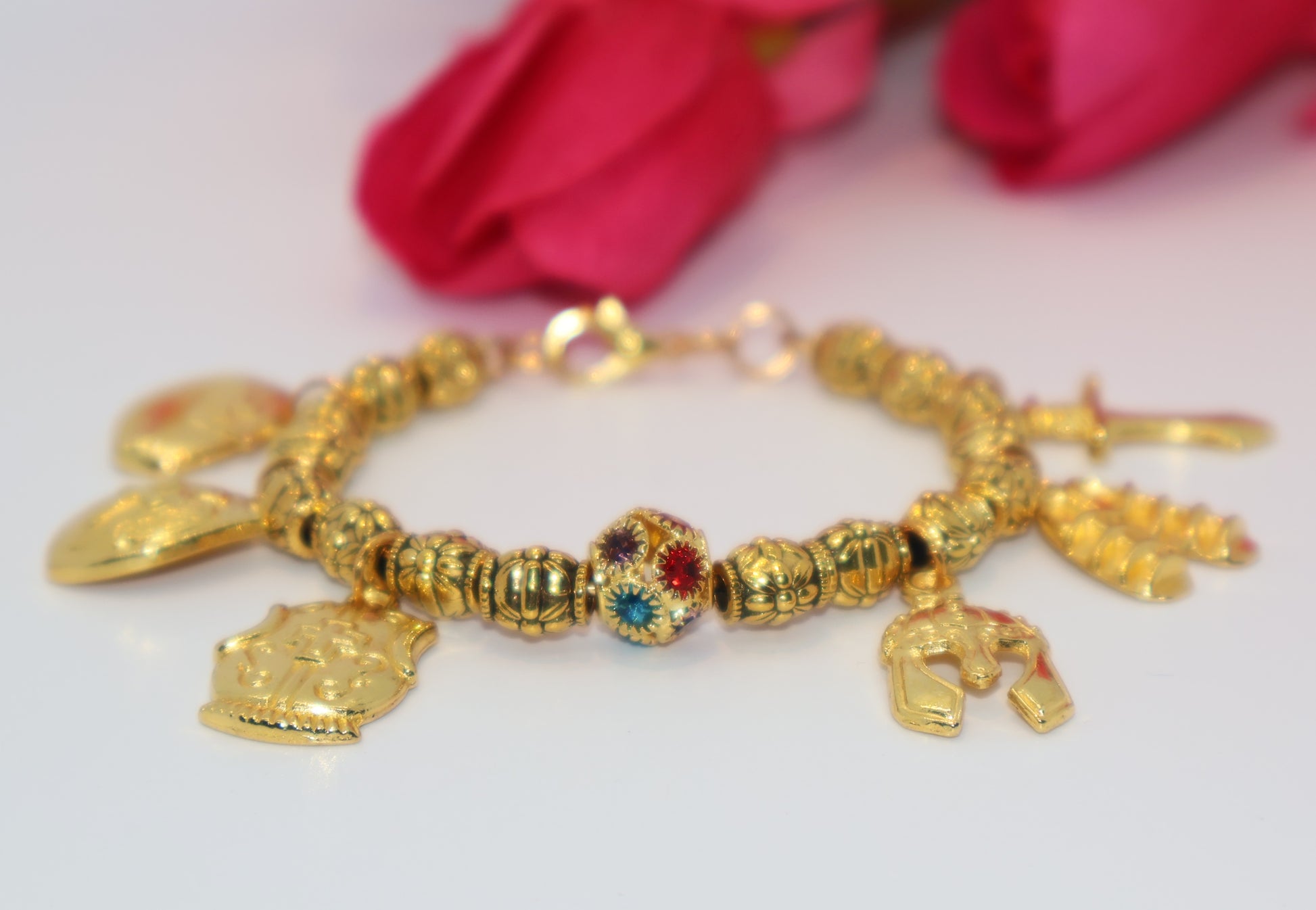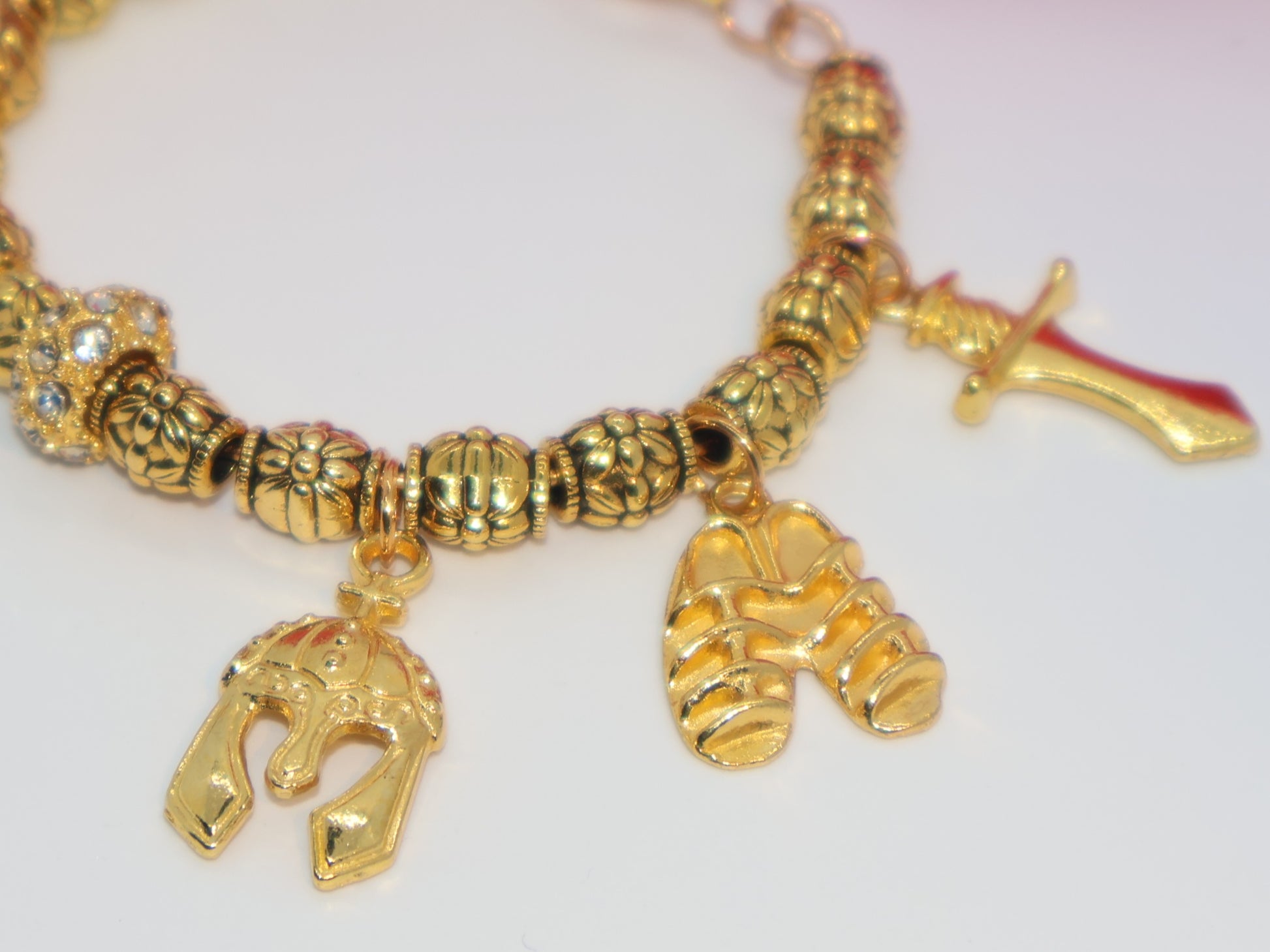 Put on the full Armor of God Charm Bracelet. The Tibetan spacer beads have a flower design.