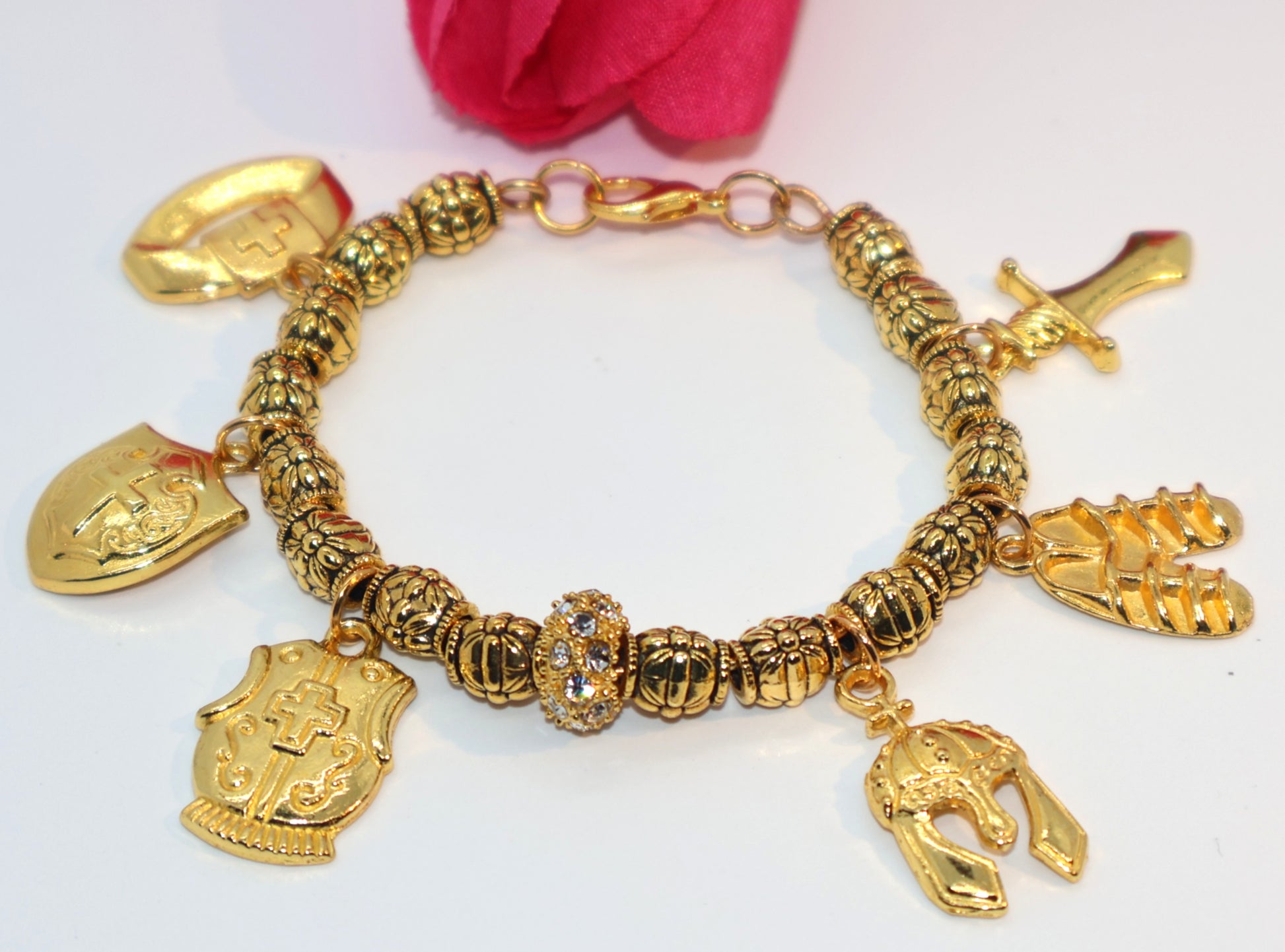 Put on the full Armor of God Charm Bracelet. The Tibetan spacer beads have a flower design.